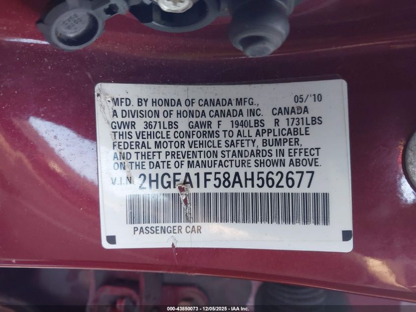 2010 HONDA CIVIC 2010 року Бензин, 1.8, Передній привід, vin - 2HGFA1F58AH562677 з США