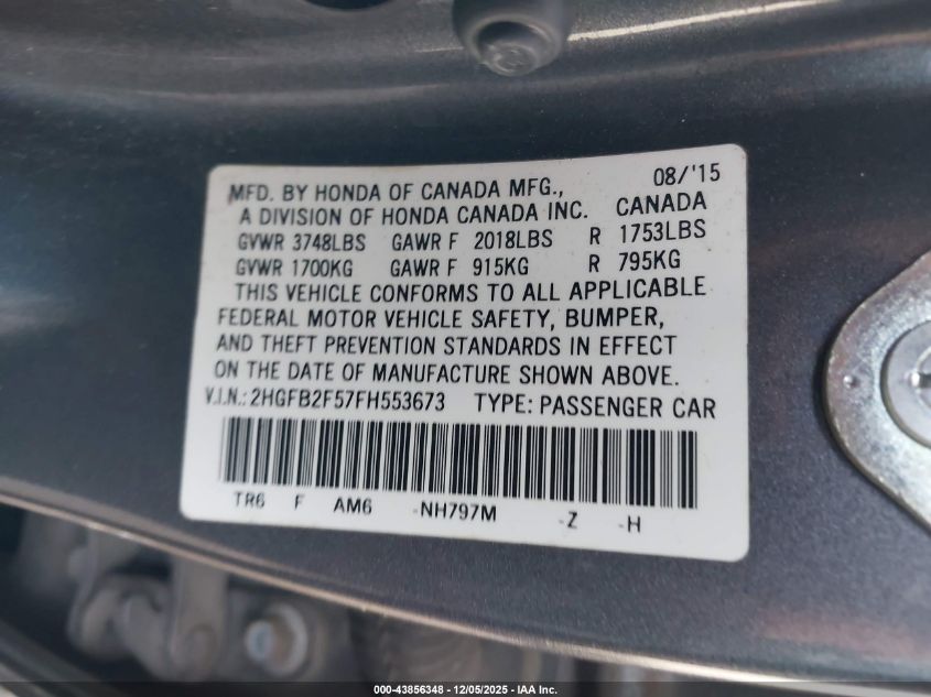 2015 HONDA CIVIC 2015 року Бензин, 1.8, Передній привід, vin - 2HGFB2F57FH553673 з США