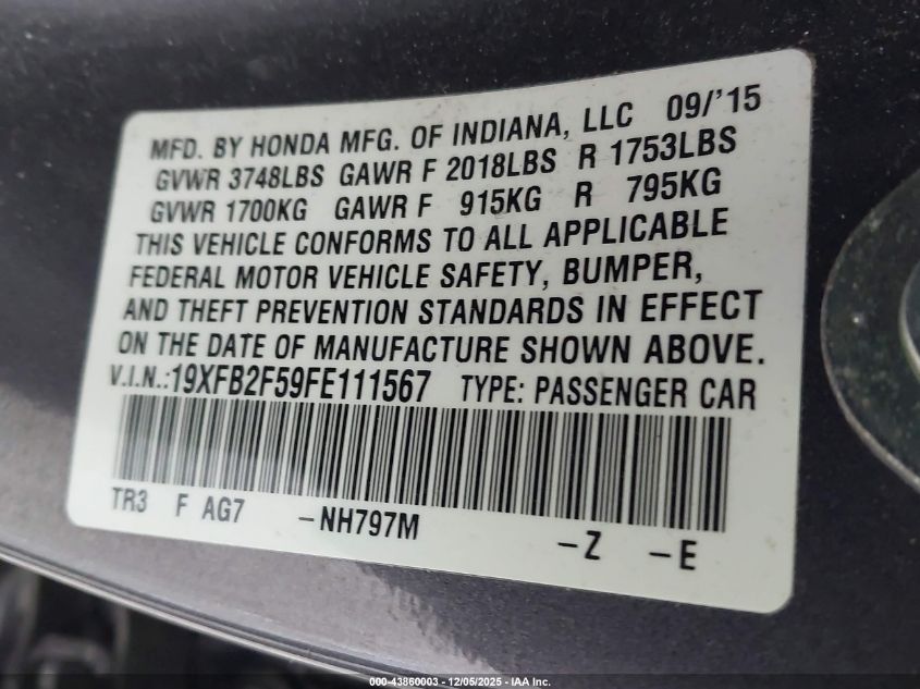2015 HONDA CIVIC 2015 року Бензин, 1.8, Передній привід, vin - 19XFB2F59FE111567 з США