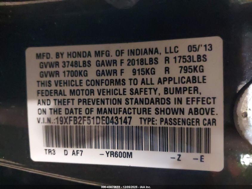 2013 HONDA CIVIC 2013 року Бензин, 1.8, Передній привід, vin - 19XFB2F51DE043147 з США