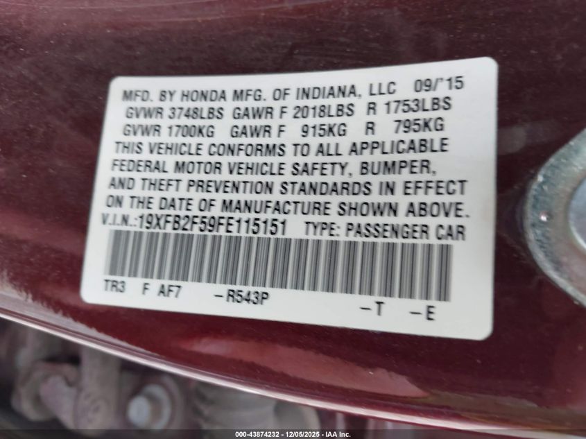 2015 HONDA CIVIC 2015 року Бензин, 1.8, Передній привід, vin - 19XFB2F59FE115151 з США