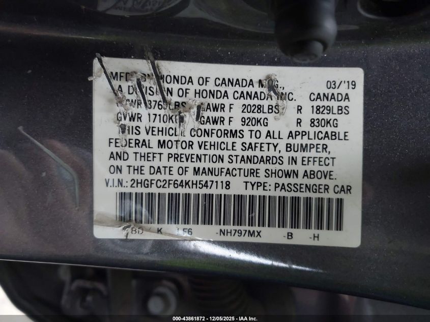 2019 HONDA CIVIC 2019 року Бензин, 2.0, Передній привід, vin - 2HGFC2F64KH547118 з США