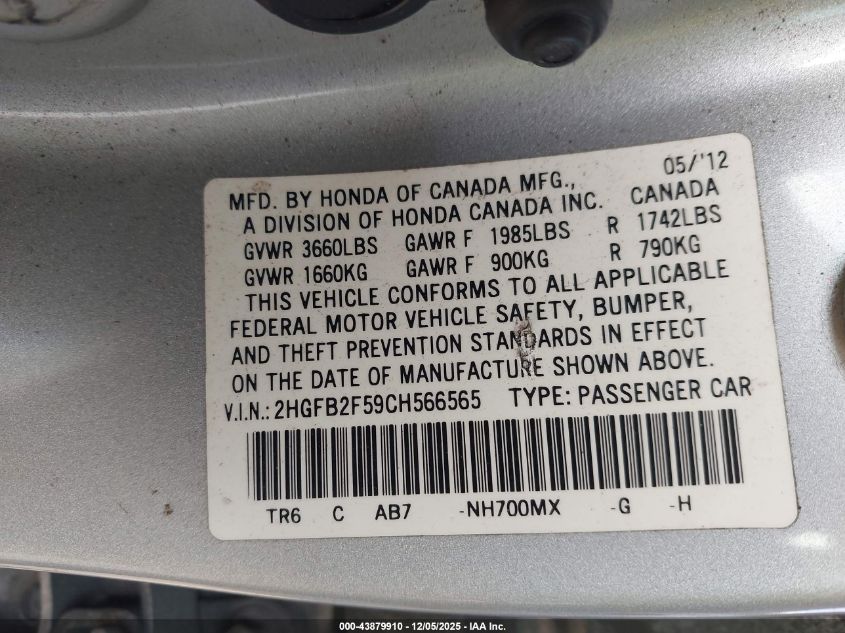 2012 HONDA CIVIC 2012 року Бензин, 1.8, Передній привід, vin - 2HGFB2F59CH566565 з США
