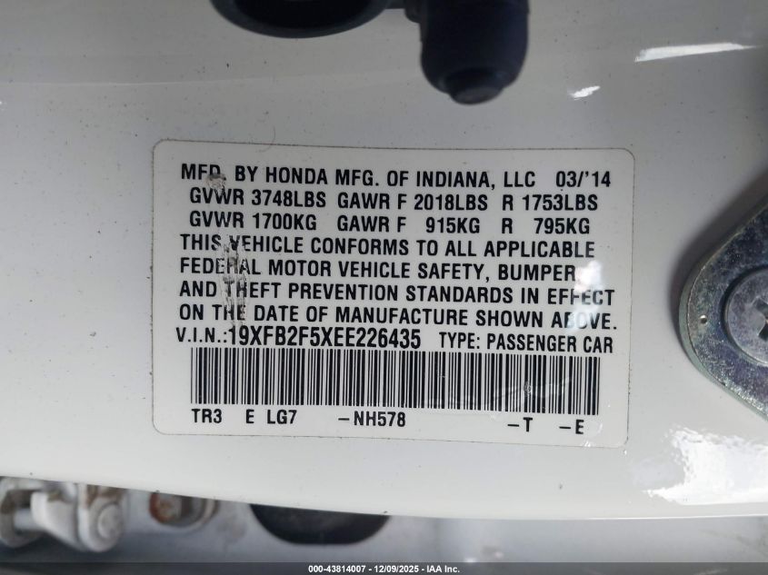 Колір БілийЦиліндри 4Привід Передній привідVIN 19XFB2F5XEE226435Стан Заводиться та їде (перевірено)Ушкодження Ліва сторона AutoRIA