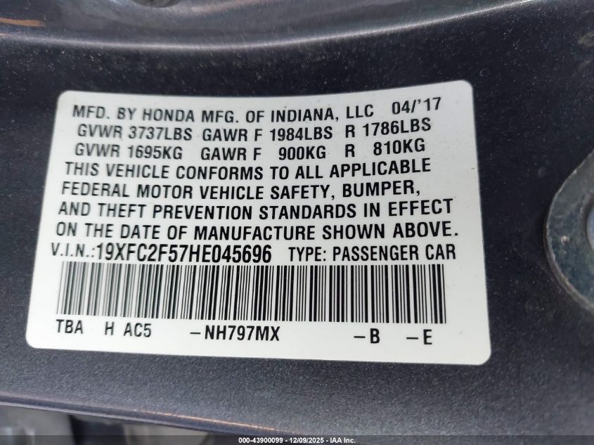 2017 HONDA CIVIC 2017 року Бензин, 2.0, Передній привід, vin - 19XFC2F57HE045696 з США