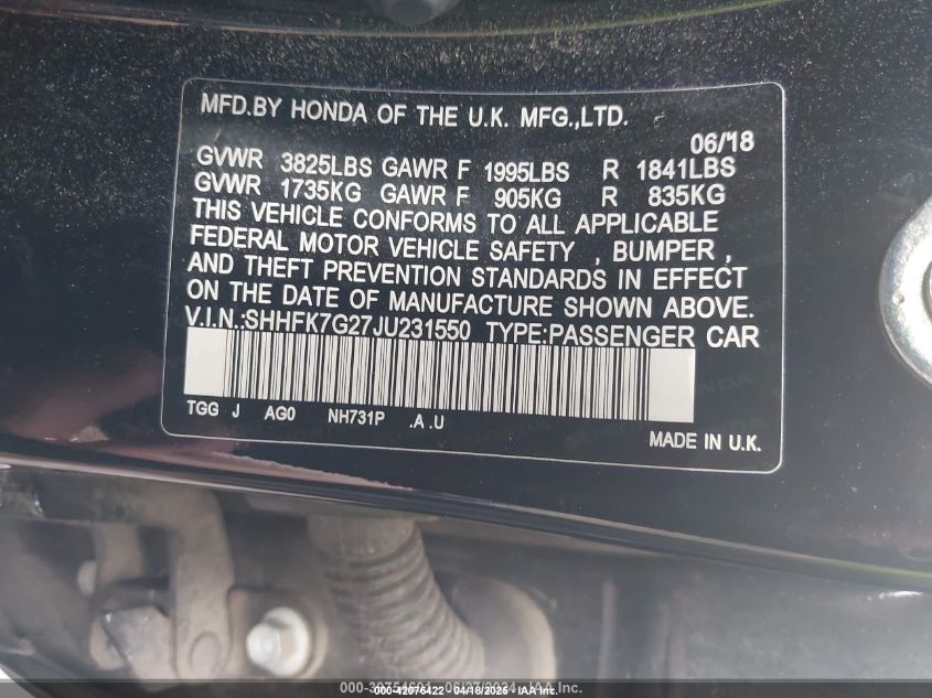 2018 HONDA CIVIC 2018 року Бензин, 1.5, Передній привід, vin - SHHFK7G27JU231550 з США