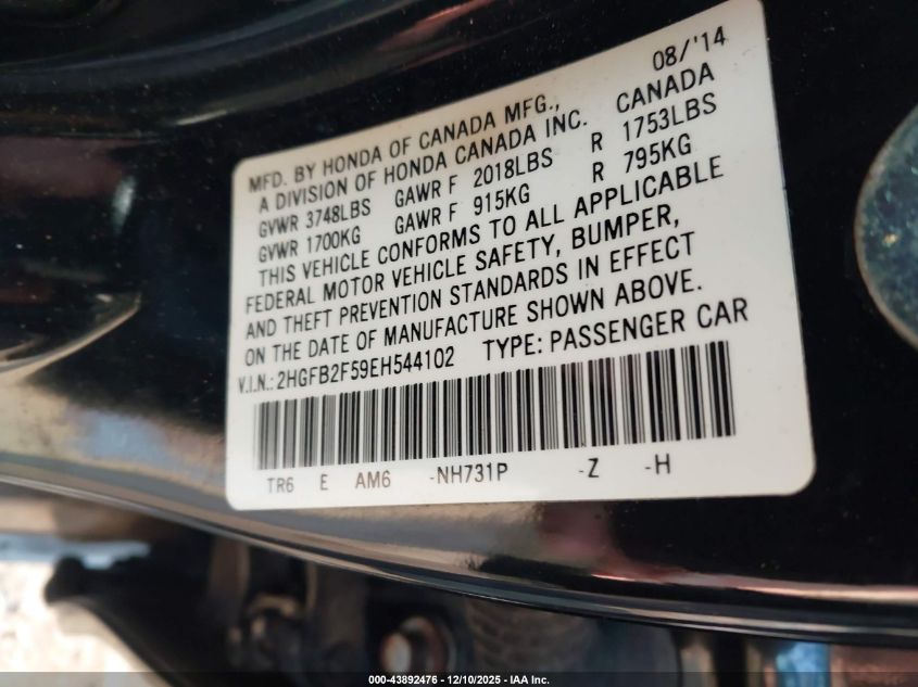 2014 HONDA CIVIC 2014 року Бензин, 1.8, Передній привід, vin - 2HGFB2F59EH544102 з США
