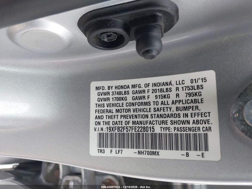 2015 HONDA CIVIC 2015 року Бензин, 1.8, Передній привід, vin - 19XFB2F57FE228015 з США