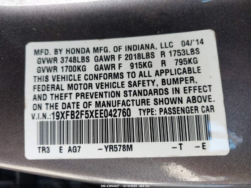 2014 HONDA CIVIC 2014 року Бензин, 1.8, Передній привід, vin - 19XFB2F5XEE042760 з США