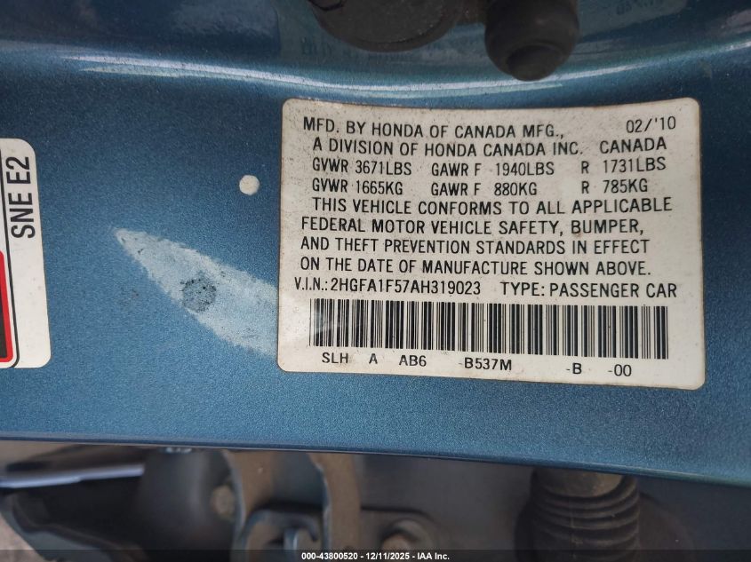 2010 HONDA CIVIC 2010 року Бензин, 1.8, Передній привід, vin - 2HGFA1F57AH319023 з США