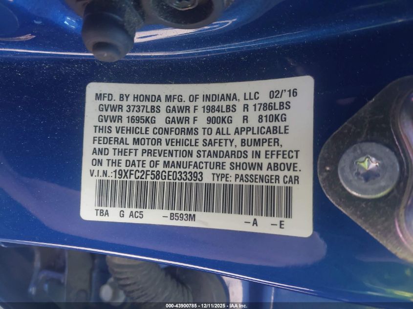 2016 HONDA CIVIC 2016 року Бензин, 2.0, Передній привід, vin - 19XFC2F58GE033393 з США