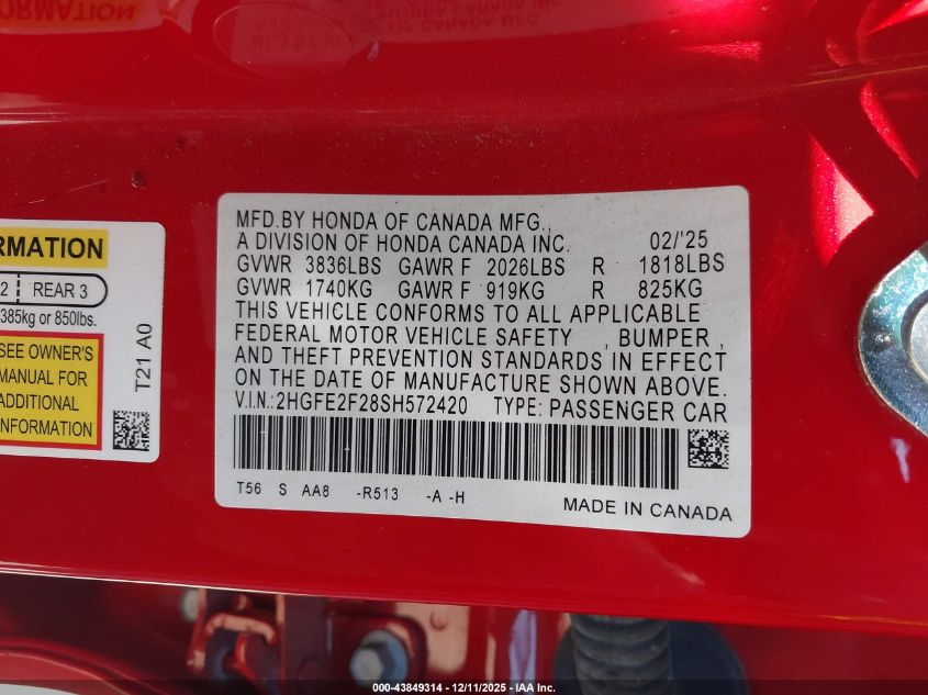 2025 HONDA CIVIC 2025 року Бензин, 2.0, Передній привід, vin - 2HGFE2F28SH572420 з США