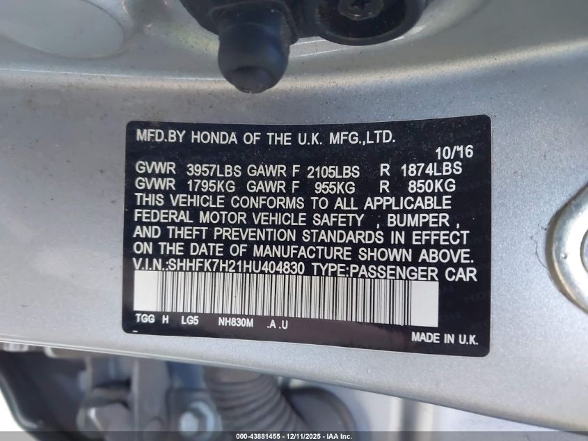 2017 HONDA CIVIC 2017 року Бензин, 1.5, Передній привід, vin - SHHFK7H21HU404830 з США