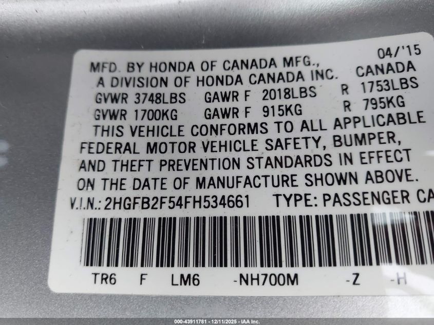 2015 HONDA CIVIC 2015 року Бензин, 1.8, Передній привід, vin - 2HGFB2F54FH534661 з США