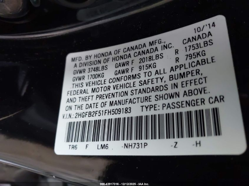 2015 HONDA CIVIC 2015 року Бензин, 1.8, Передній привід, vin - 2HGFB2F51FH509183 з США
