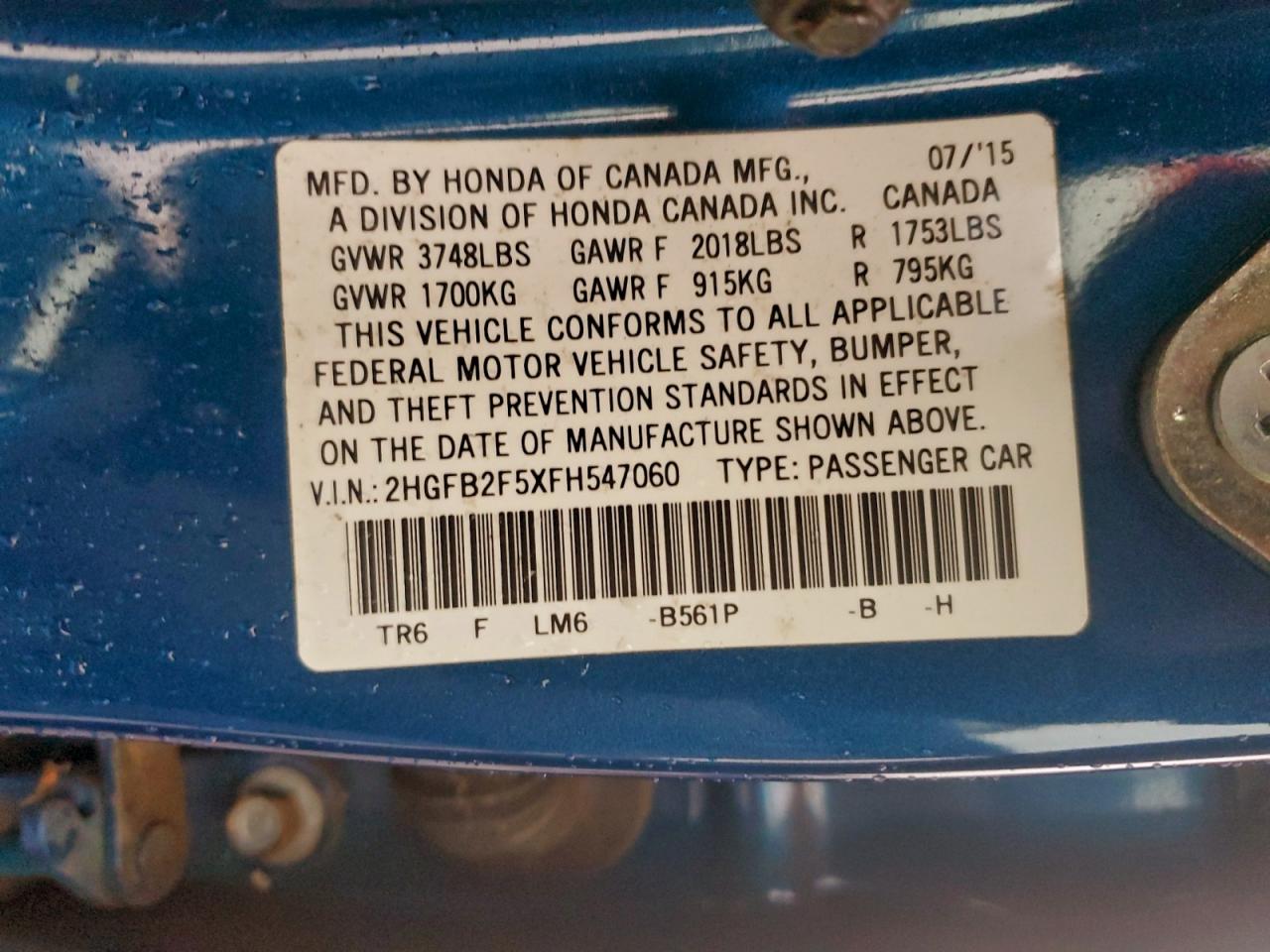 Колір СинійЦиліндри 4VIN 2HGFB2F5XFH547060Стан НевідомоУшкодження Передня або задня AutoRIA