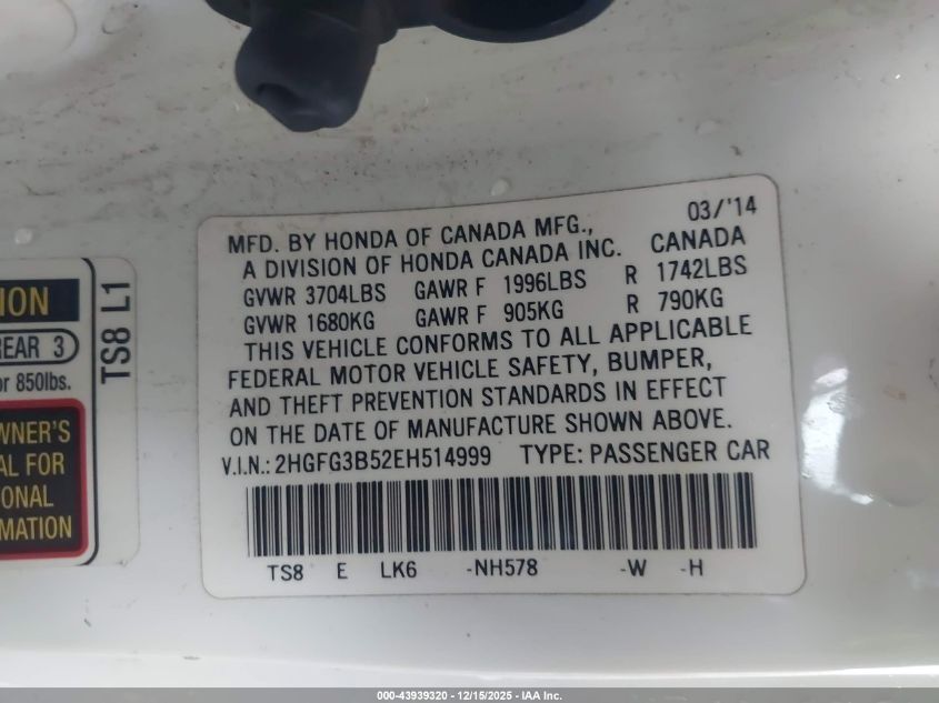 Колір БілийЦиліндри 4Привід Передній привідVIN 2HGFG3B52EH514999Стан Заводиться та їде (перевірено)Ушкодження Передня або задня AutoRIA