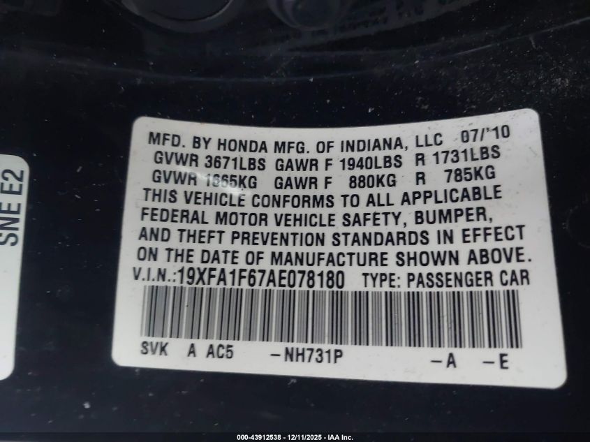 2010 HONDA CIVIC 2010 року Бензин, 1.8, Передній привід, vin - 19XFA1F67AE078180 з США