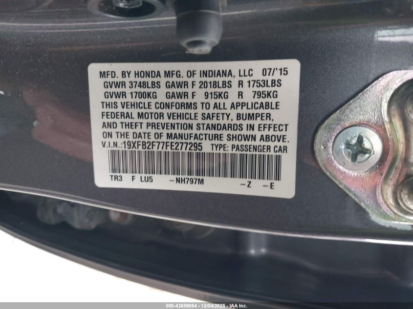 2015 HONDA CIVIC 2015 року Бензин, 1.8, Передній привід, vin - 19XFB2F77FE277295 з США