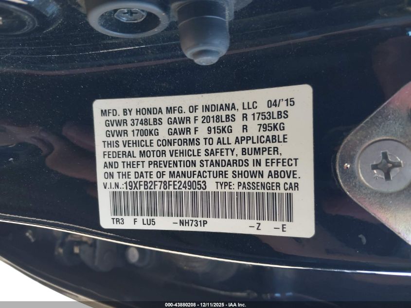 2015 HONDA CIVIC 2015 року Бензин, 1.8, Передній привід, vin - 19XFB2F78FE249053 з США