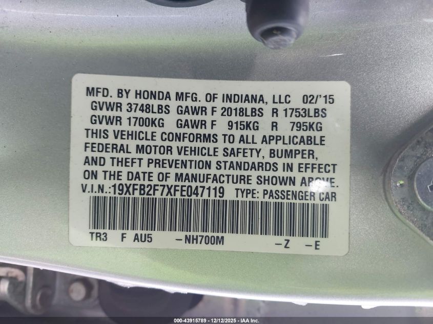 2015 HONDA CIVIC 2015 року Бензин, 1.8, Передній привід, vin - 19XFB2F7XFE047119 з США