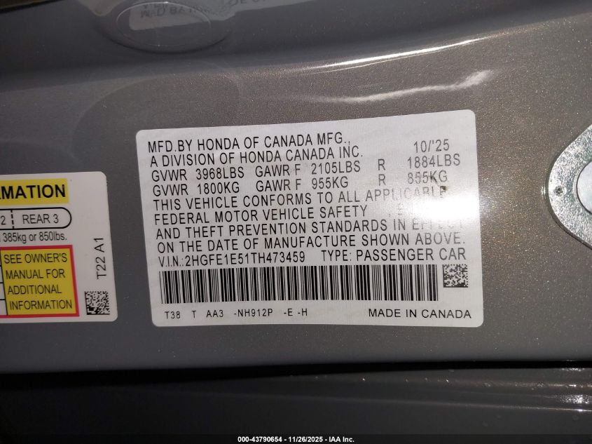 2026 HONDA CIVIC 2026 року Бензин, 1.5, Передній привід, vin - 2HGFE1E51TH473459 з США