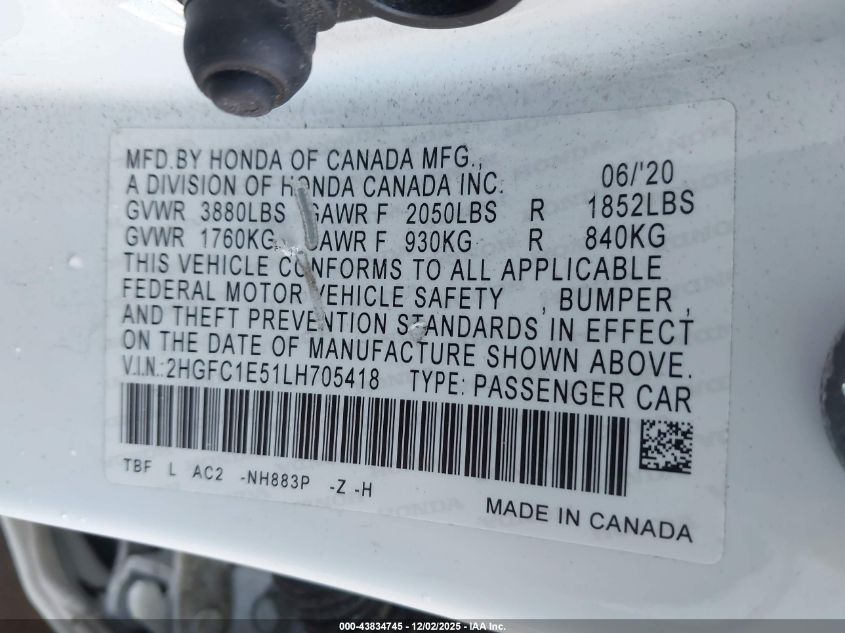 2020 HONDA CIVIC 2020 року Бензин, 1.5, Передній привід, vin - 2HGFC1E51LH705418 з США
