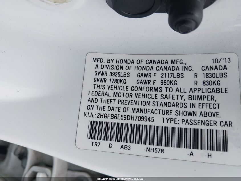 2013 HONDA CIVIC 2013 року Бензин, 2.4, Передній привід, vin - 2HGFB6E59DH709945 з США