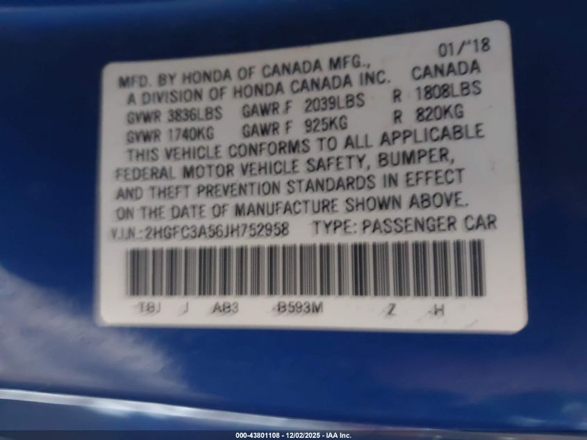 2018 HONDA CIVIC 2018 року Бензин, 1.5, Передній привід, vin - 2HGFC3A56JH752958 з США
