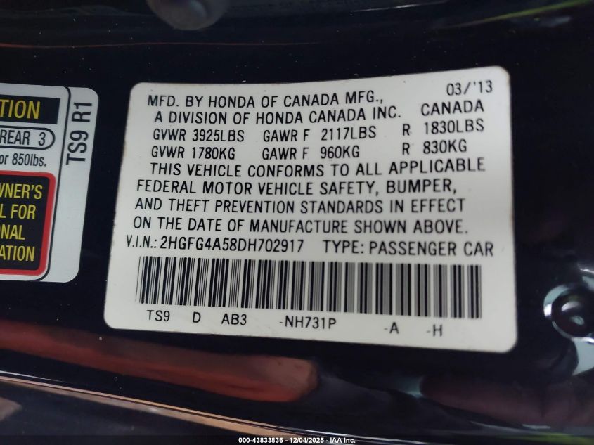 2013 HONDA CIVIC 2013 року Бензин, 2.4, Передній привід, vin - 2HGFG4A58DH702917 з США