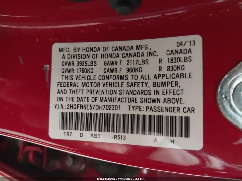 2013 HONDA CIVIC 2013 року Бензин, 2.4, Передній привід, vin - 2HGFB6E57DH702301 з США