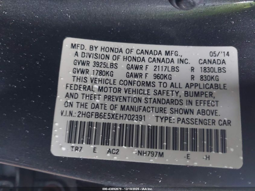 2014 HONDA CIVIC 2014 року Бензин, 2.4, Передній привід, vin - 2HGFB6E5XEH702391 з США
