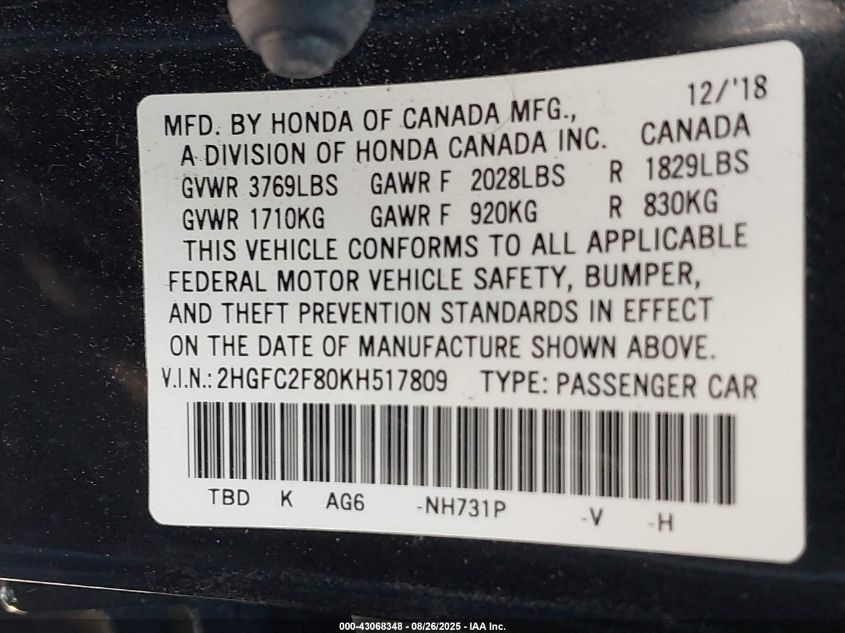 2019 HONDA CIVIC 2019 року Бензин, 2.0, Передній привід, vin - 2HGFC2F80KH517809 з США