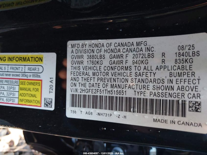 2026 HONDA CIVIC 2026 року Бензин, 2.0, Передній привід, vin - 2HGFE2F51TH515651 з США