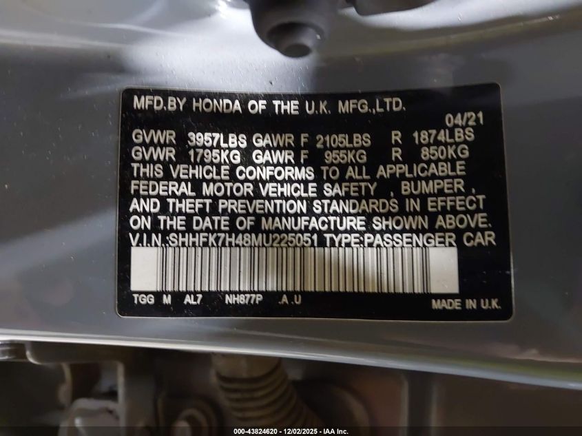 2021 HONDA CIVIC 2021 року Бензин, 1.5, Передній привід, vin - SHHFK7H48MU225051 з США
