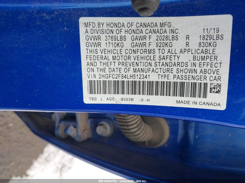 2020 HONDA CIVIC 2020 року Бензин, 2.0, Передній привід, vin - 2HGFC2F84LH512341 з США