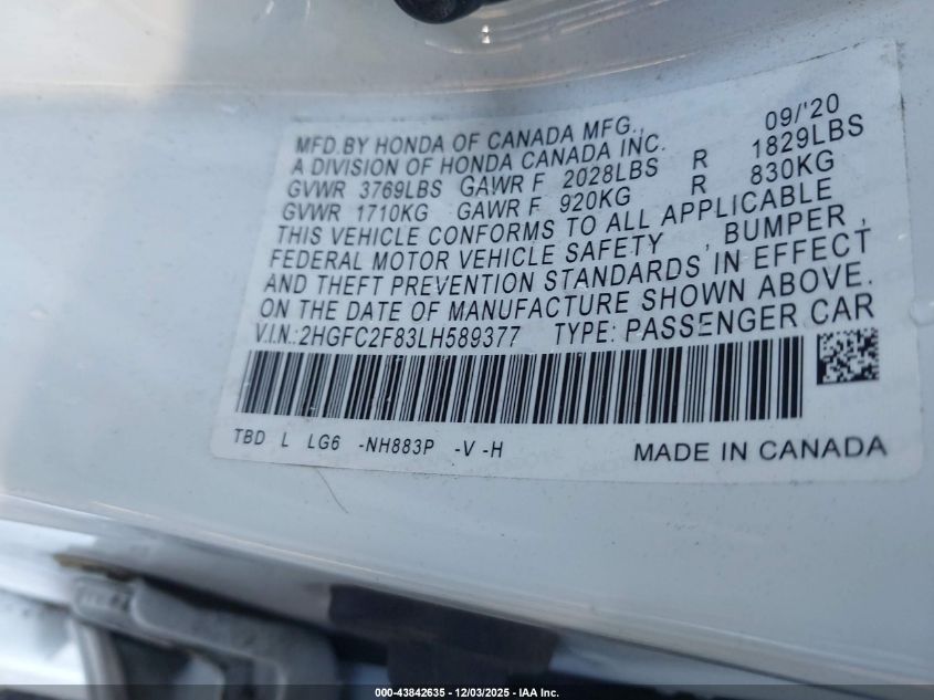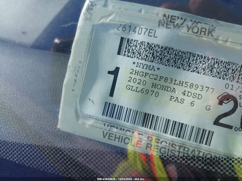 2020 HONDA CIVIC 2020 року Бензин, 2.0, Передній привід, vin - 2HGFC2F83LH589377 з США