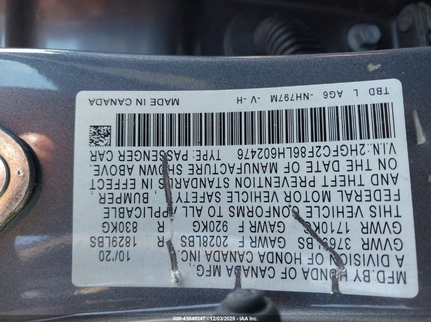 2020 HONDA CIVIC 2020 року Бензин, 2.0, Передній привід, vin - 2HGFC2F86LH602476 з США