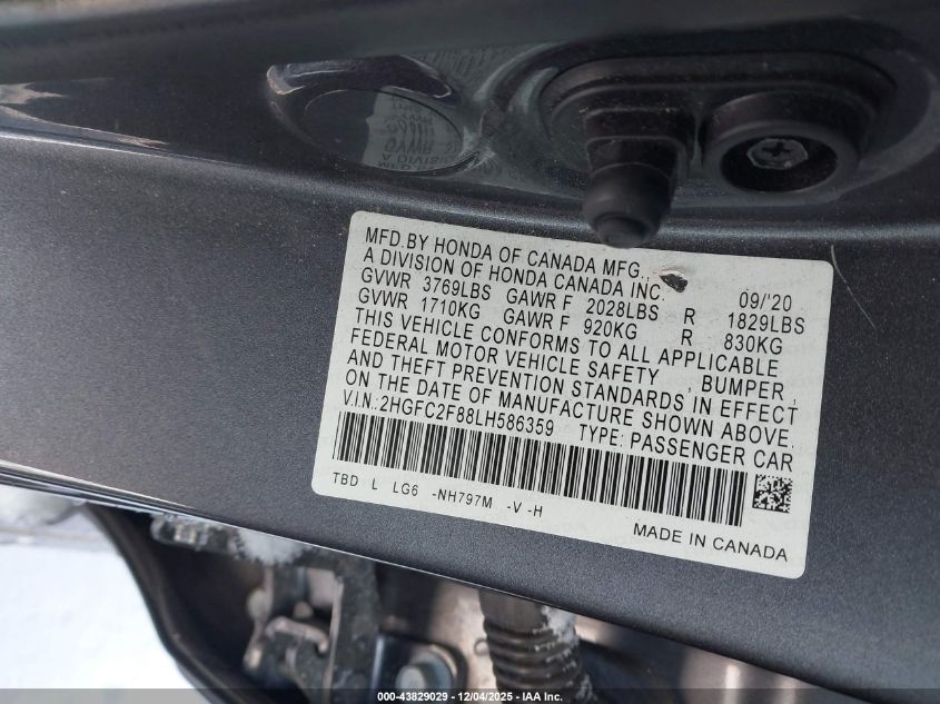 2020 HONDA CIVIC 2020 року Бензин, 2.0, Передній привід, vin - 2HGFC2F88LH586359 з США