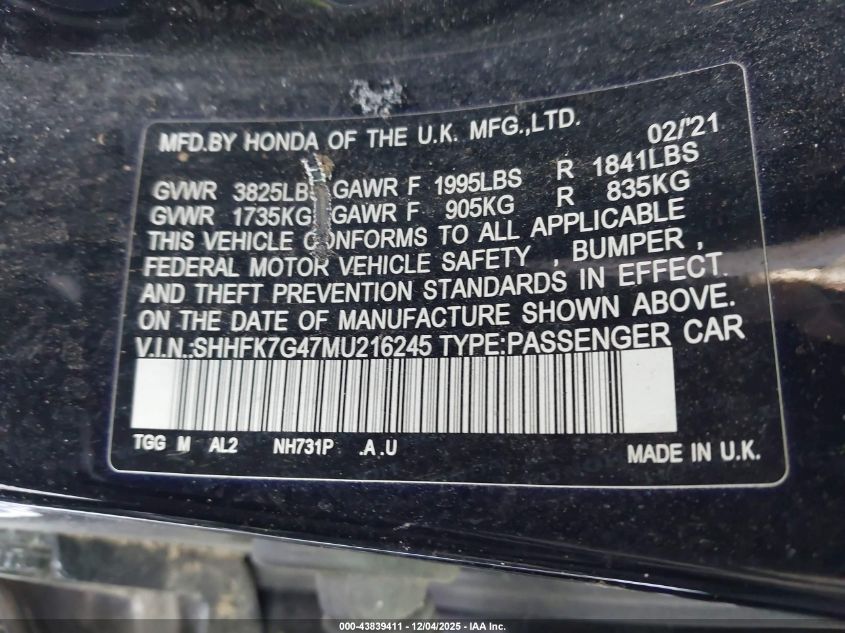 2021 HONDA CIVIC 2021 року Бензин, 1.5, Передній привід, vin - SHHFK7G47MU216245 з США