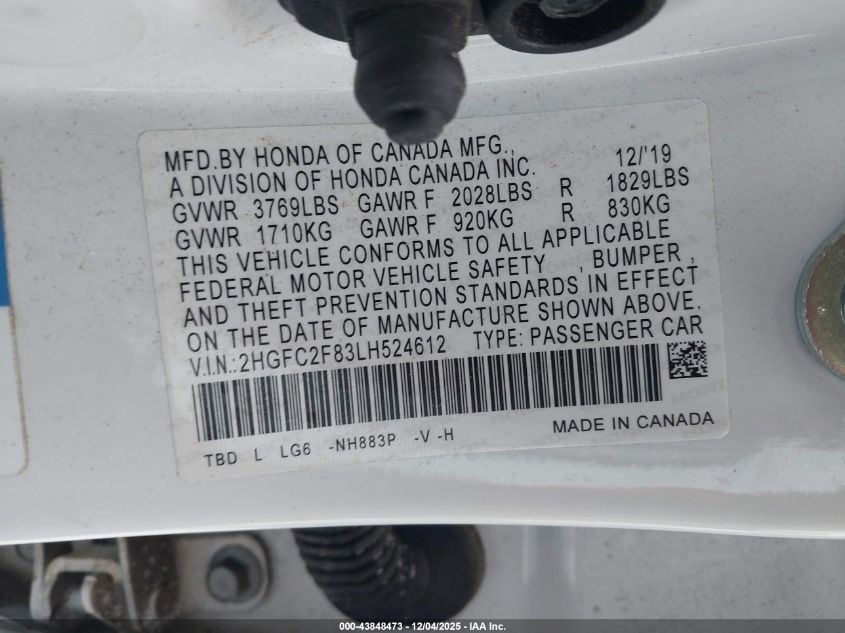 2020 HONDA CIVIC 2020 року Бензин, 2.0, Передній привід, vin - 2HGFC2F83LH524612 з США