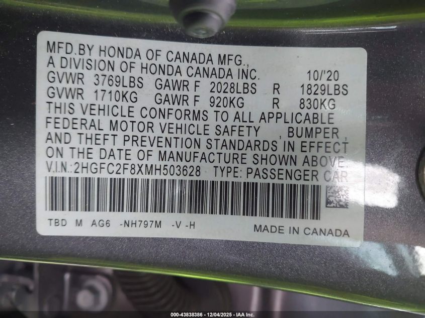2021 HONDA CIVIC 2021 року Бензин, 2.0, Передній привід, vin - 2HGFC2F8XMH503628 з США