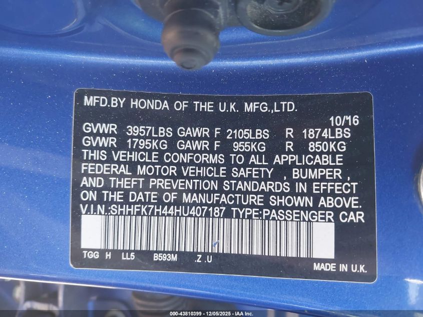 2017 HONDA CIVIC 2017 року Бензин, 1.5, Передній привід, vin - SHHFK7H44HU407187 з США