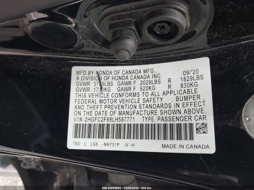 2020 HONDA CIVIC 2020 року Бензин, 2.0, Передній привід, vin - 2HGFC2F88LH587771 з США