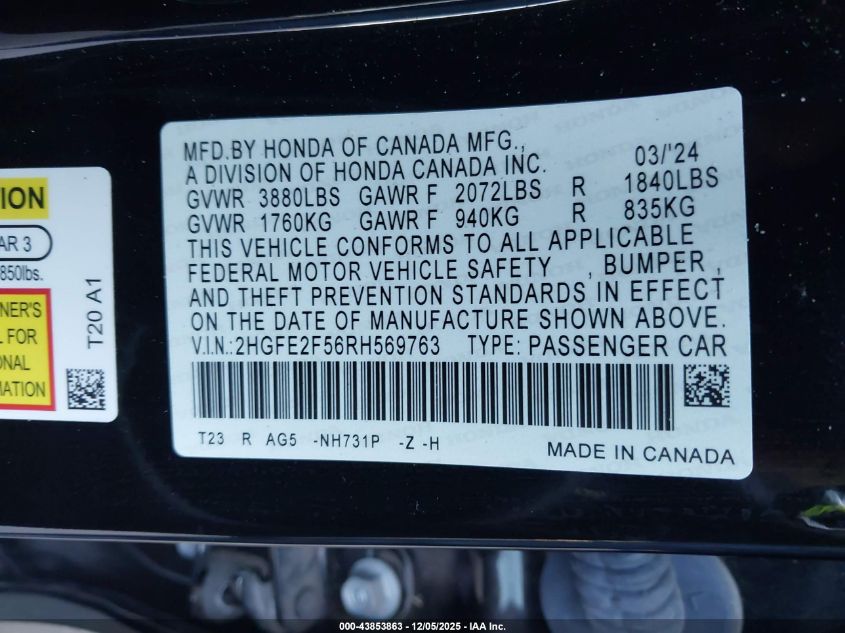 2024 HONDA CIVIC 2024 року Бензин, 2.0, Передній привід, vin - 2HGFE2F56RH569763 з США