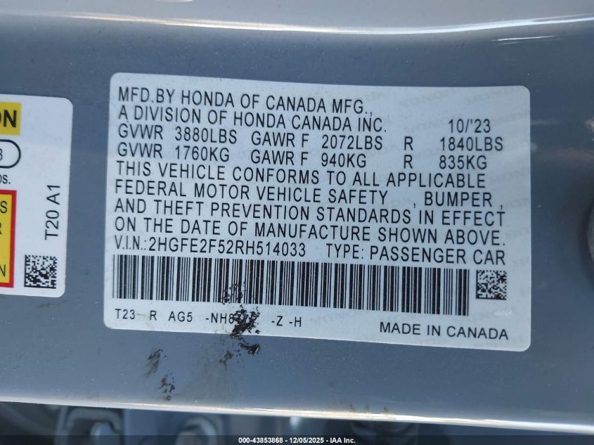 2024 HONDA CIVIC 2024 року Бензин, 2.0, Передній привід, vin - 2HGFE2F52RH514033 з США