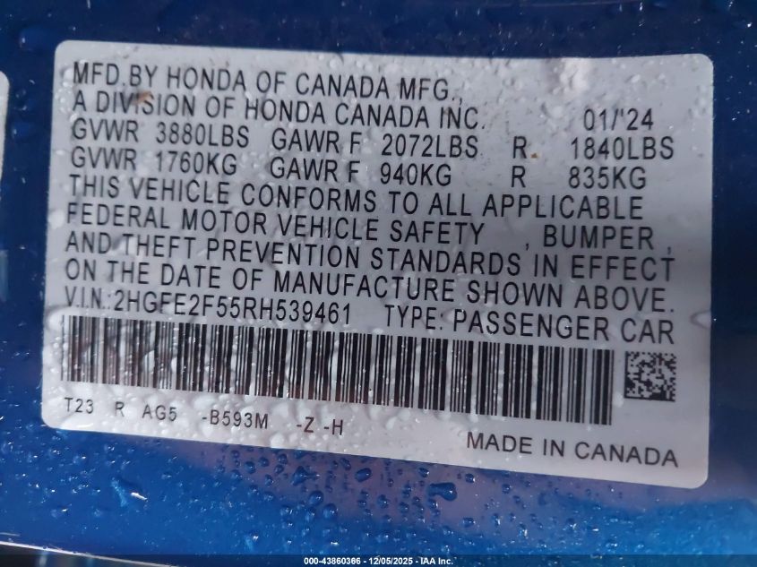 2024 HONDA CIVIC 2024 року Бензин, 2.0, Передній привід, vin - 2HGFE2F55RH539461 з США