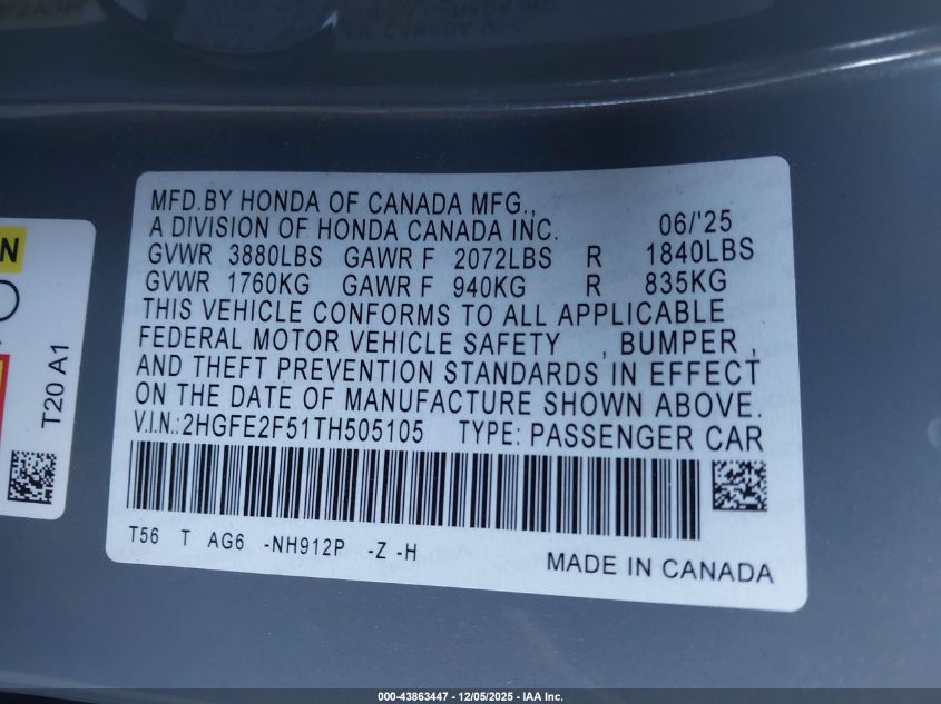 2026 HONDA CIVIC 2026 року Бензин, 2.0, Передній привід, vin - 2HGFE2F51TH505105 з США