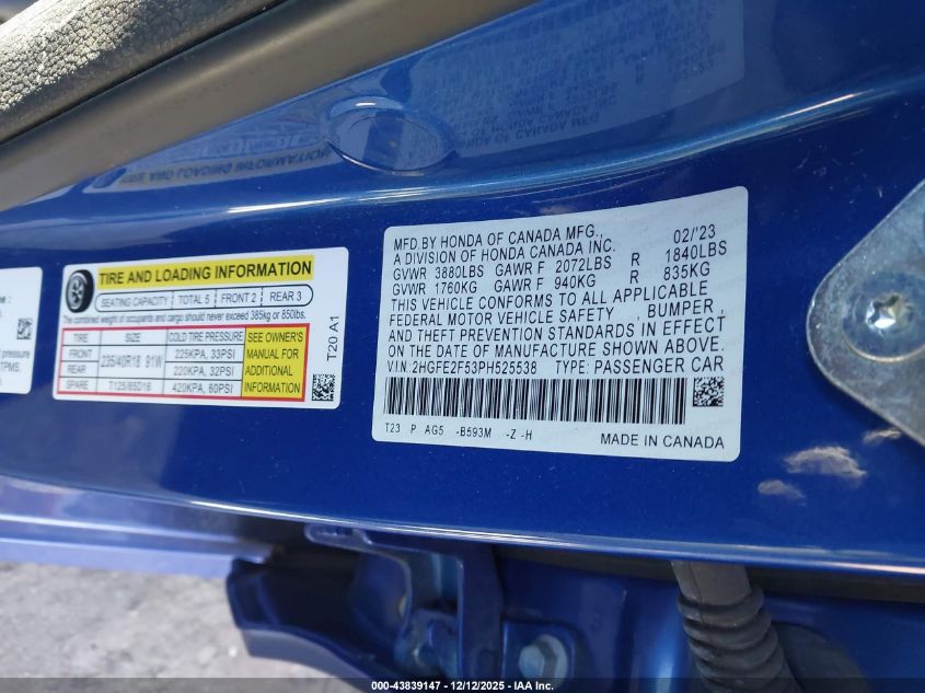2023 HONDA CIVIC 2023 року Бензин, 2.0, Передній привід, vin - 2HGFE2F53PH525538 з США