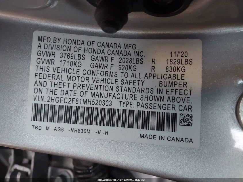 2021 HONDA CIVIC 2021 року Бензин, 2.0, Передній привід, vin - 2HGFC2F81MH520303 з США